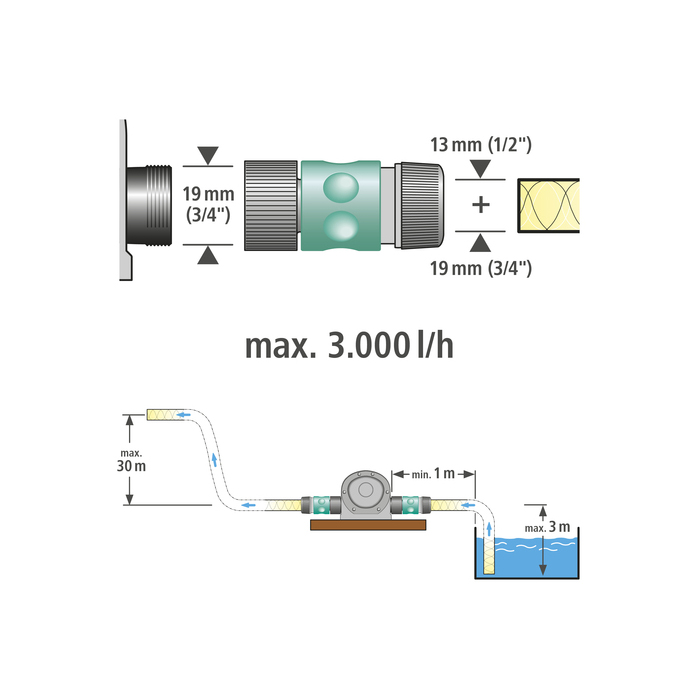 Boremaskinepumpen er udført i metalhus som giver lang levetid og modstandsdygtighed. Pumpen må IKKE bruges til brandbare væsker. Den kan bruges både med 1/2 og 3/4" slanger og er udstyret med 3/4" gevind.