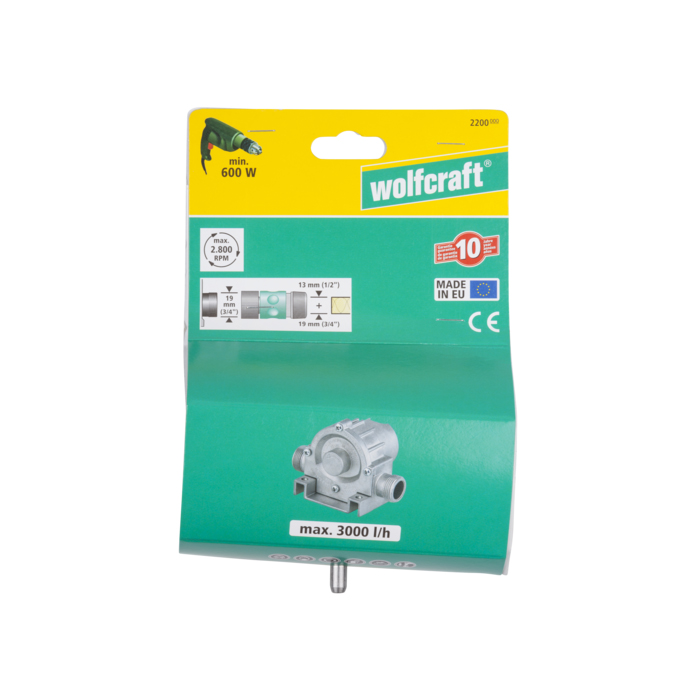 Wolfcraft boremaskinepumpe som kan flytte op til 3000 liter vand i timen.