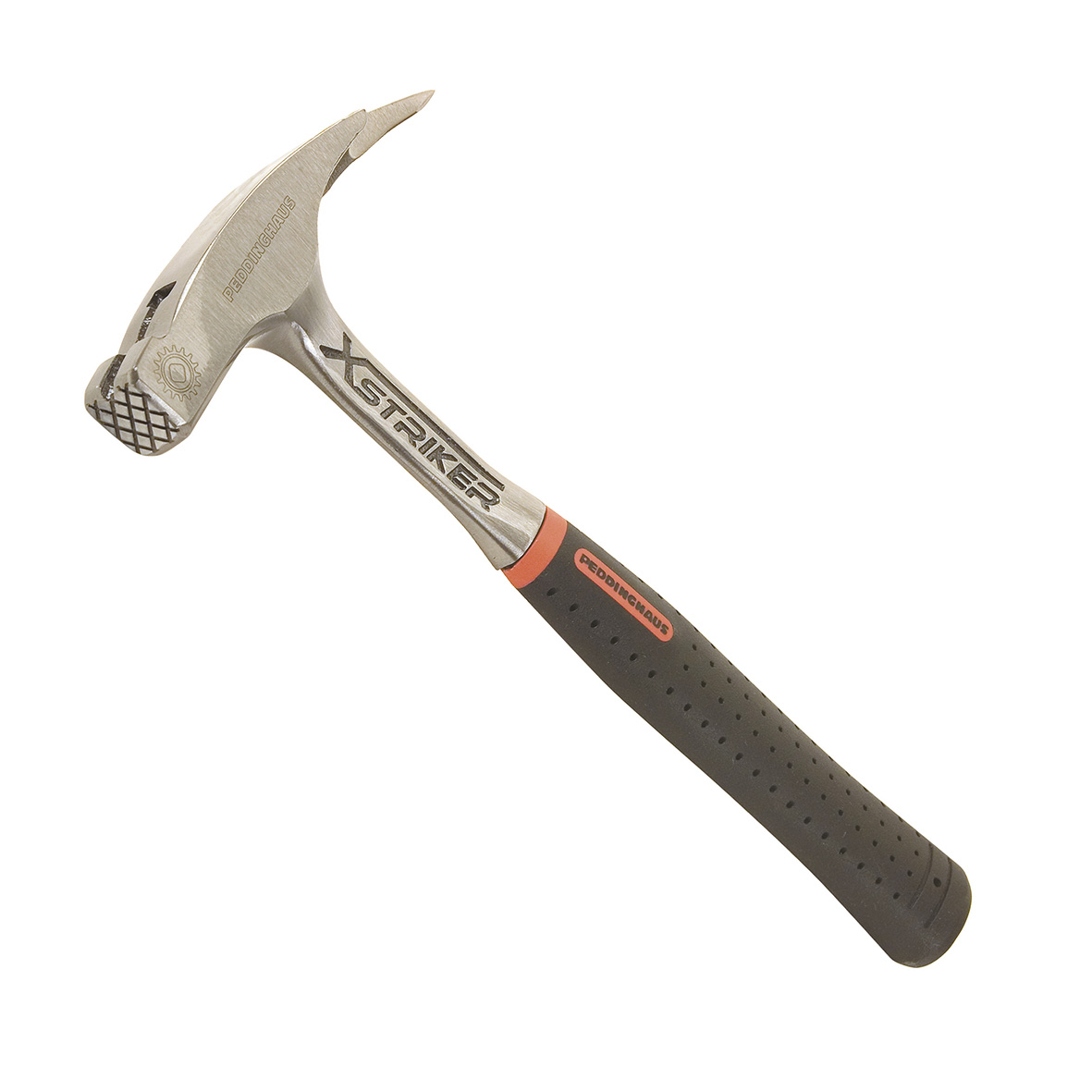 Helsmedet XSTRIKER lægtehammer med vibrationsdæmpet 2K-greb, magnetisk sømholder og riflet bane.