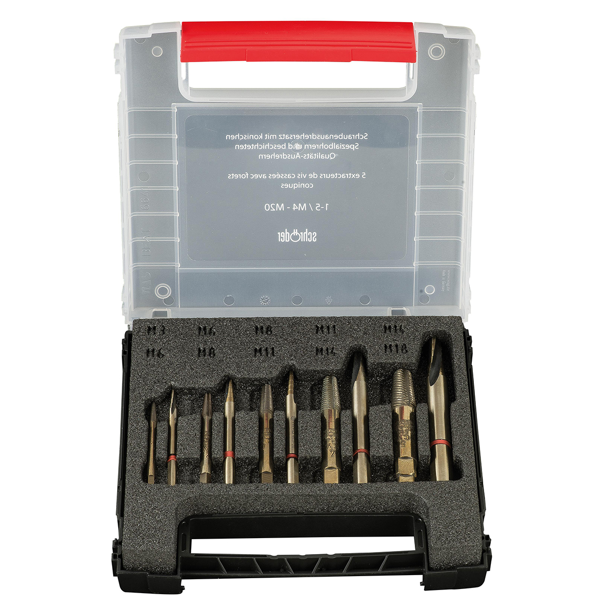 Schröder skrueudtrækkersæt. Det perfelte sæt til knækkede skruer, gevind mm. Leveres inkl. 5 koniske specialbor og 5 skrueudtrækkere så sættet kan bruges til skruer fra M4 til M20 eller til gevindtappe fra M3 til M16.