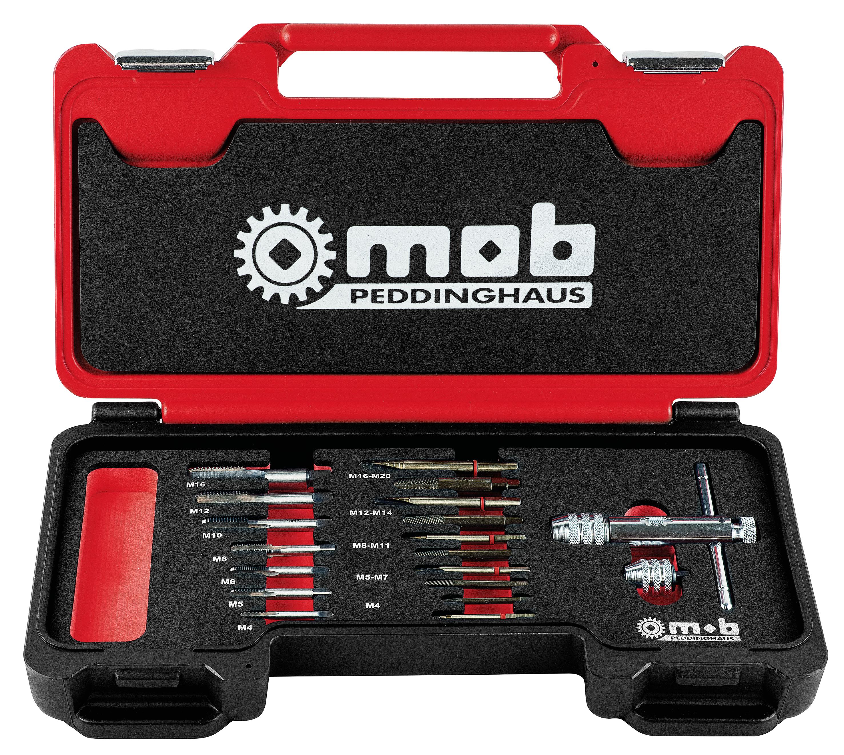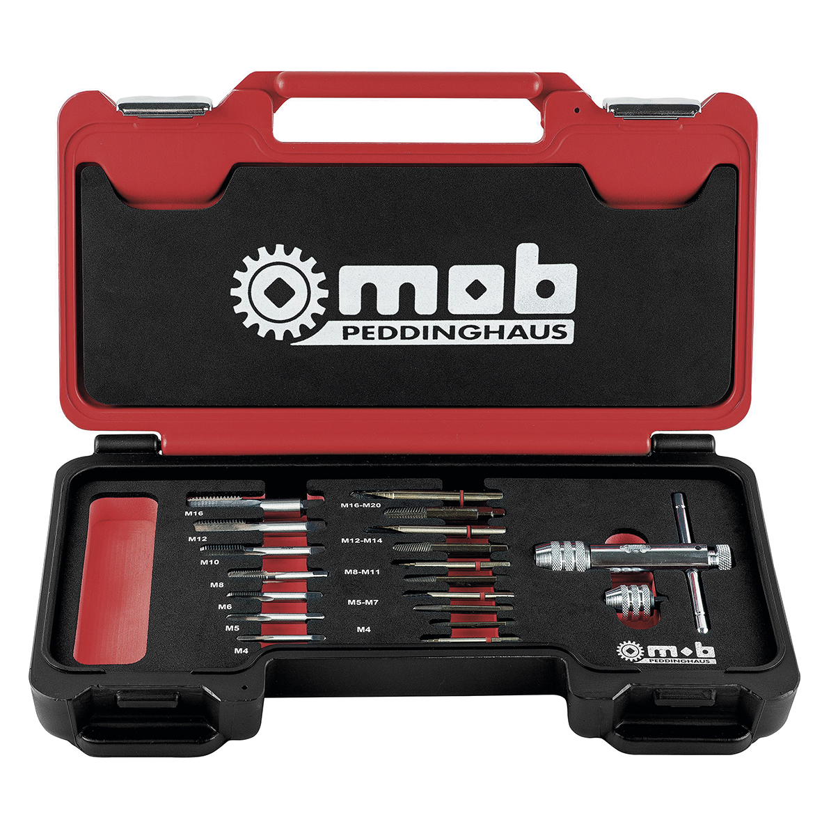 Schröder skrueudtrækkersæt COMPLETE. Det perfelte sæt til knækkede skruer, gevind mm. Leveres inkl. 7 gevindtappe M4 + M5 + M6 + M8 + M10 + M12 + M16, 5 koniske specialbor samt universal værktøjsholder med skralde, ekstra adapterhoved og 5 skrueudtrækkere så sættet kan bruges til skruer fra M4 til M20 eller til gevindtappe fra M3 til M16.