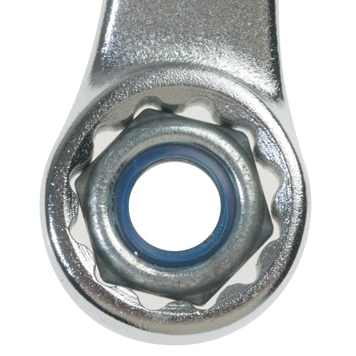 Ringgaffelnøgle med gaffel og 12-kantet specialprofil, som sikrer mindre slid på fastgørelsen.