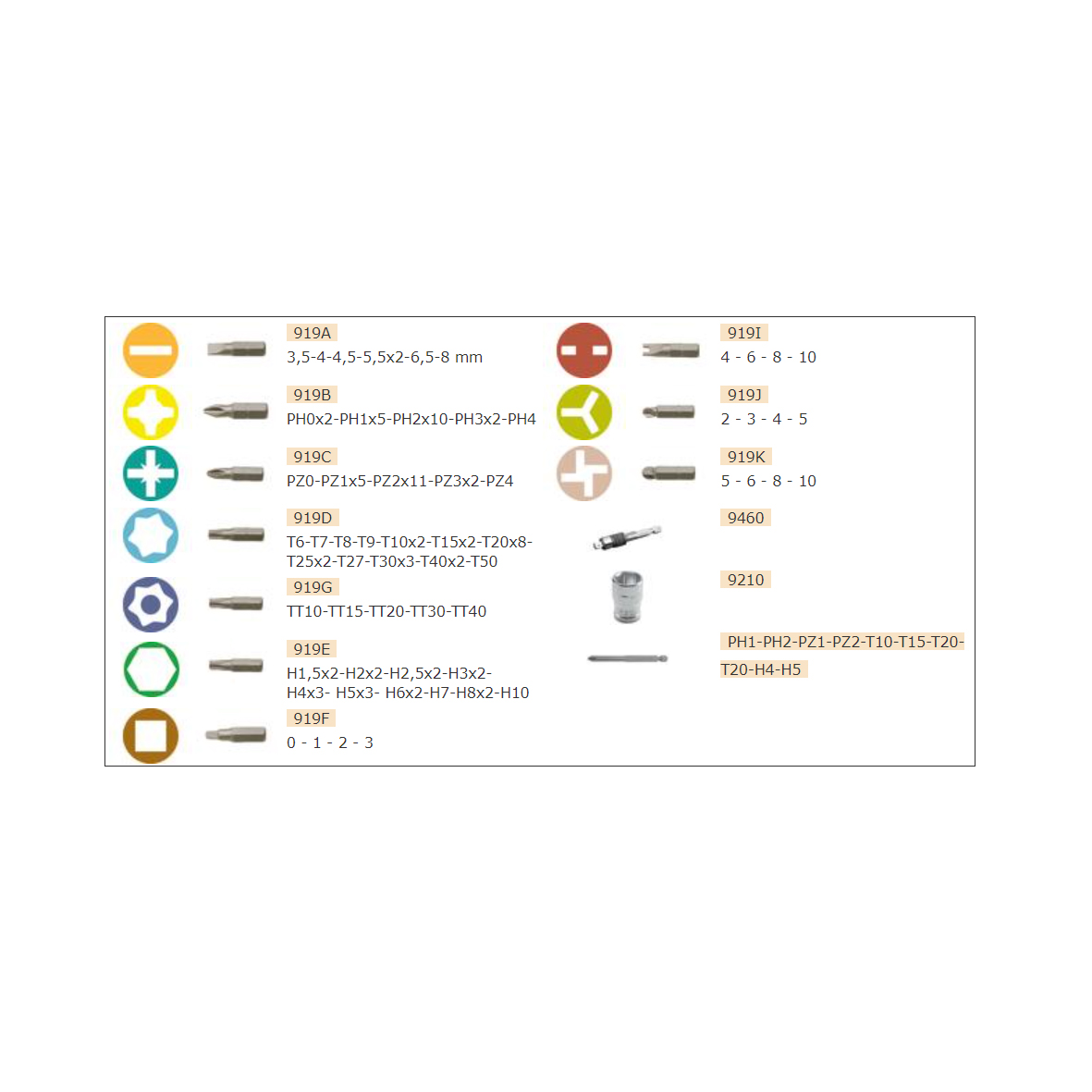 Indhold:25 mm bits:• 8 x lige: 3, 4, 4.5, 5.5, 6 mm• 2 x lige: 6.5, 8 mm• 17 x Pozidriv: 2x PZ0, 5x PZ1, 7x PZ2, 2x PZ3, PZ4• 21 x Phillips: 2x PH0, 5x PH1, 8x PH2, 2x PH3, PH4• 15 x Hex: H2, H2.5, H3, 3x H4, 3x H5, 3x H6, H7, H8, H10• 17 x Torx: 3x T10, 3x T15, 3x T20, 3x T25, T27, 3x T30, T40• 7 x Tamper Torx: TT10, TT15, TT20, TT25, TT27, TT30, TT40• 4 x Square: 0, 1, 2, 3• 4 x Spanner: 4, 6, 8, 10• 4 x Tri-wing: 2, 3, 4, 5• 4 x Torq-set: 5, 6, 8, 1075 mm bits:• 2 x Phillips: PH1, PH2• 2 x Pozidriv: PZ1, PZ2• 2 x Hex: H4, H5• 4 x Torx: T10, T15, T20, T25• 5 x 1/4“ top: 7, 8, 10, 12, 13 mm• 1 x 2-i-1 adapter