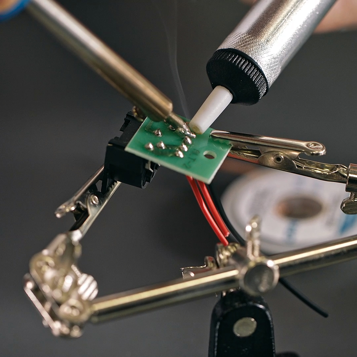 Holdes direkte mod loddestedet, hvor den udløses og suger det opvarmede loddetin væk fra stedet.