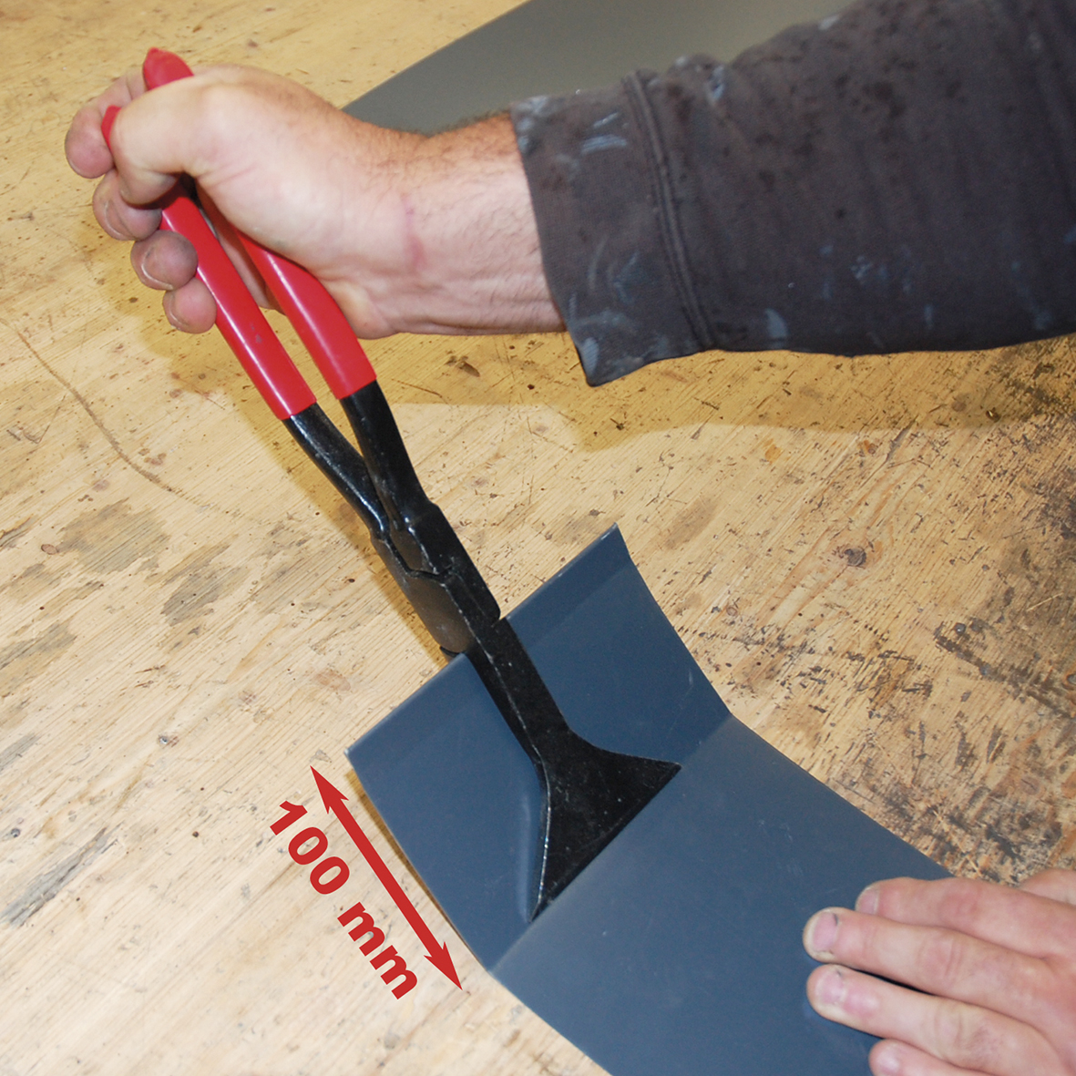 Sænksmedet paraplyfalstang med langt indstik på 100 mm, gennemstukket led, hærdede kæber og let afrundede kanter.