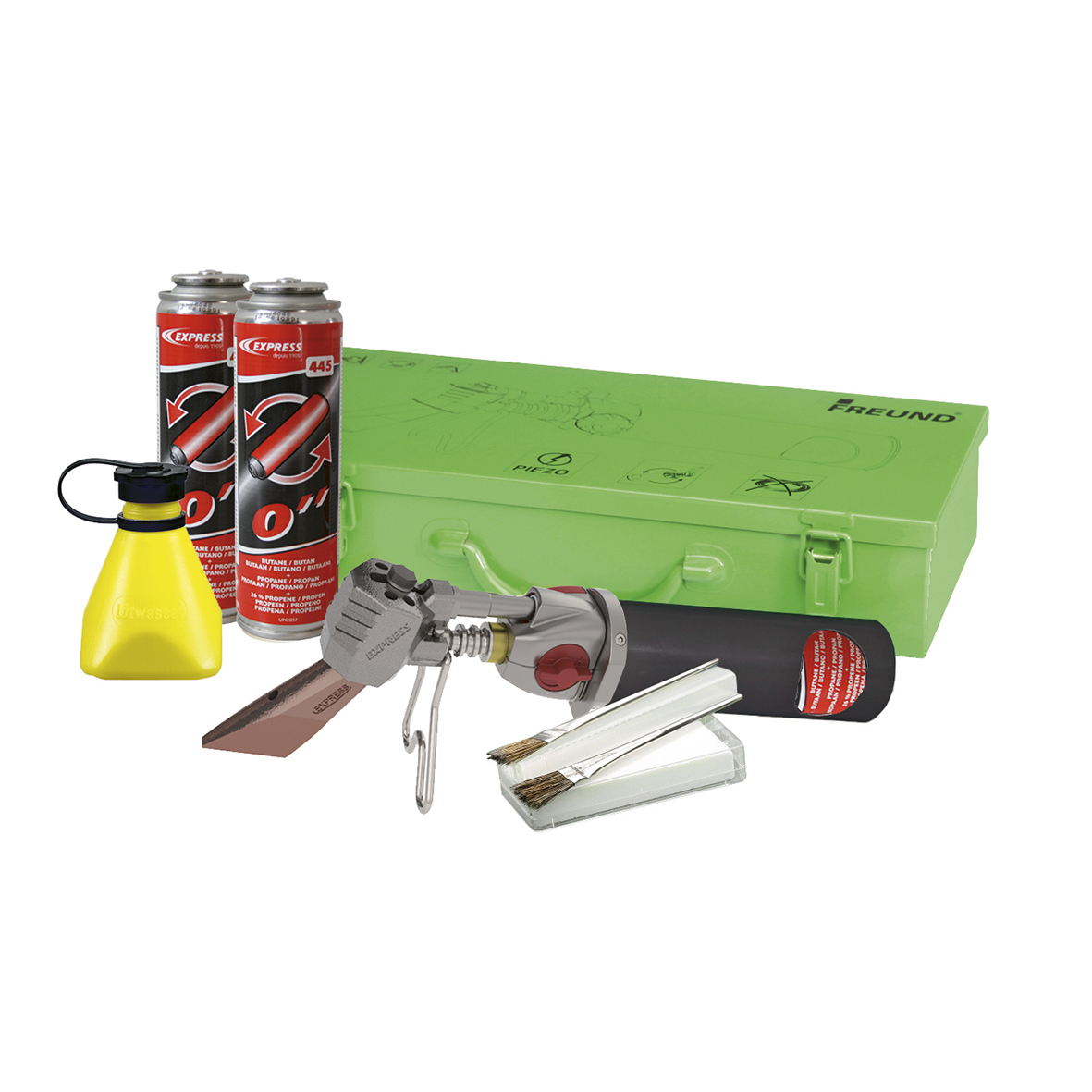 Freund/Express gasloddekolbe sæt i metalkasse. Ingen slanger og store gasflasker. Smart mobil loddekolbe, velegnet til plade- og VVS-arbejde samt reparationer.Leveres i metal-transportkasse inkl. 3 x 110 ml. "powergas 445", loddevandsflaske, salmiaksten samt 2 x syrepensel. Komplet klar til brug.