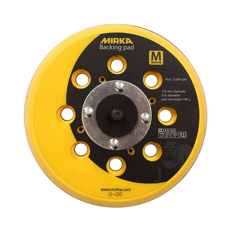 En 125 mm bagplade med et centralt luftindtag. Luftkanalerne, der fører til midten af støttepuden, har en øget luftstrøm, og derfor fjernes støvet effektivt.