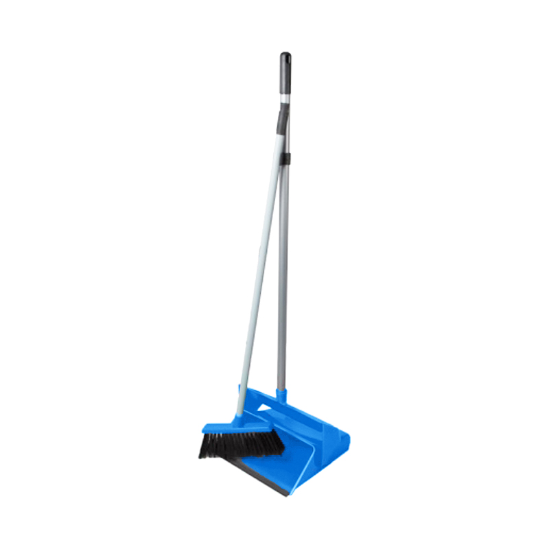 Både kost og bakke har et langt skaft, så man ikke skal bukke sig ned for at feje op