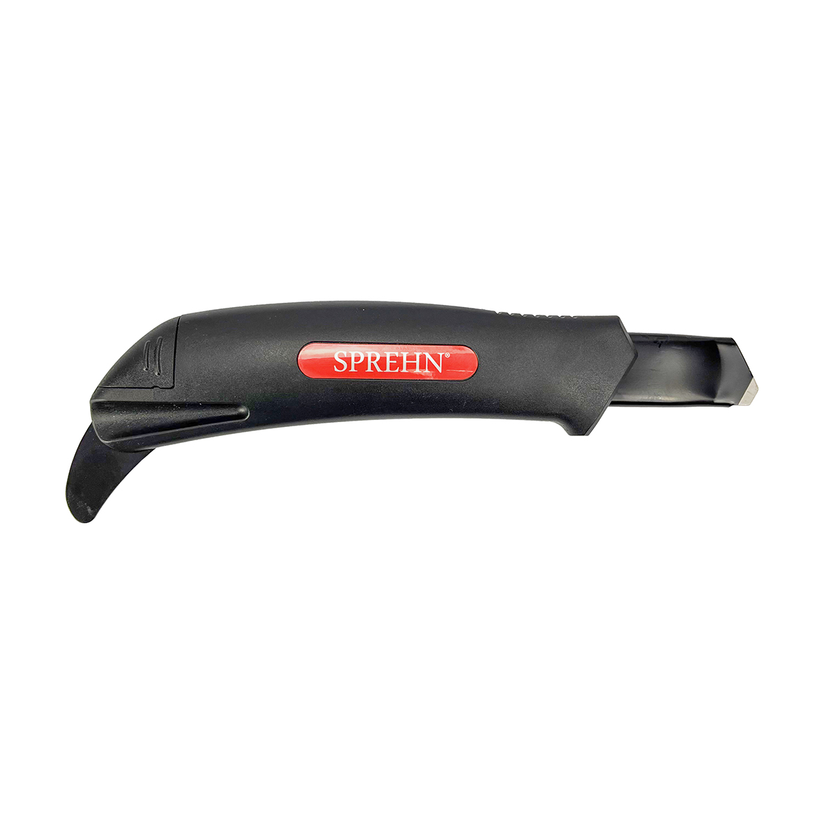 Sprehn kniv med tæppehage og skydelås til 18mm bræk af blade. Kniven har sikkerhedskniv funktion /auto retur funktion. Hærdet spids som er brugbar til åbning af malerdåser, lampeudtag etc.