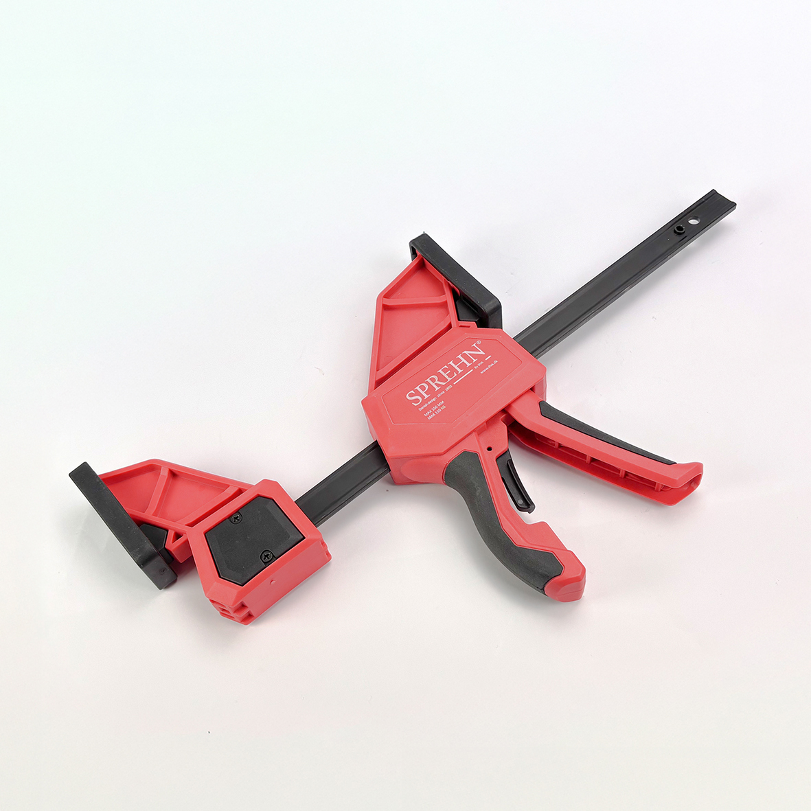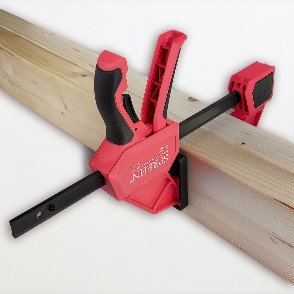 Ekstra forstærket nylon og induktionshærdet I-profil stålskinne sikrer høj styrke og lang holdbarhed. Kæbe kan vendes uden brug af værktøj, så tvingen også kan anvendes som spredetvinge. Aftagelige, bløde og store kæbepuder beskytter arbejdsemnet og forhindrer mærker.