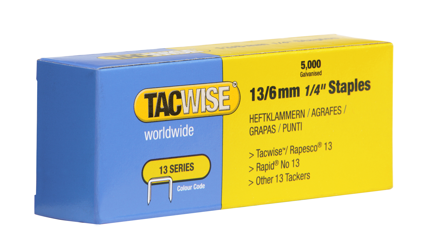 Fin tråd hæftning ideel til semi-pro / DIY applikationer. Bredt brugt til polstring og hobby håndværk applikationer. Kompatibel med Tacwise Z1-13, Z1-13L, Z3-13, Z3-13L håndtag. Kasse med 5.000 hæfteklammer.