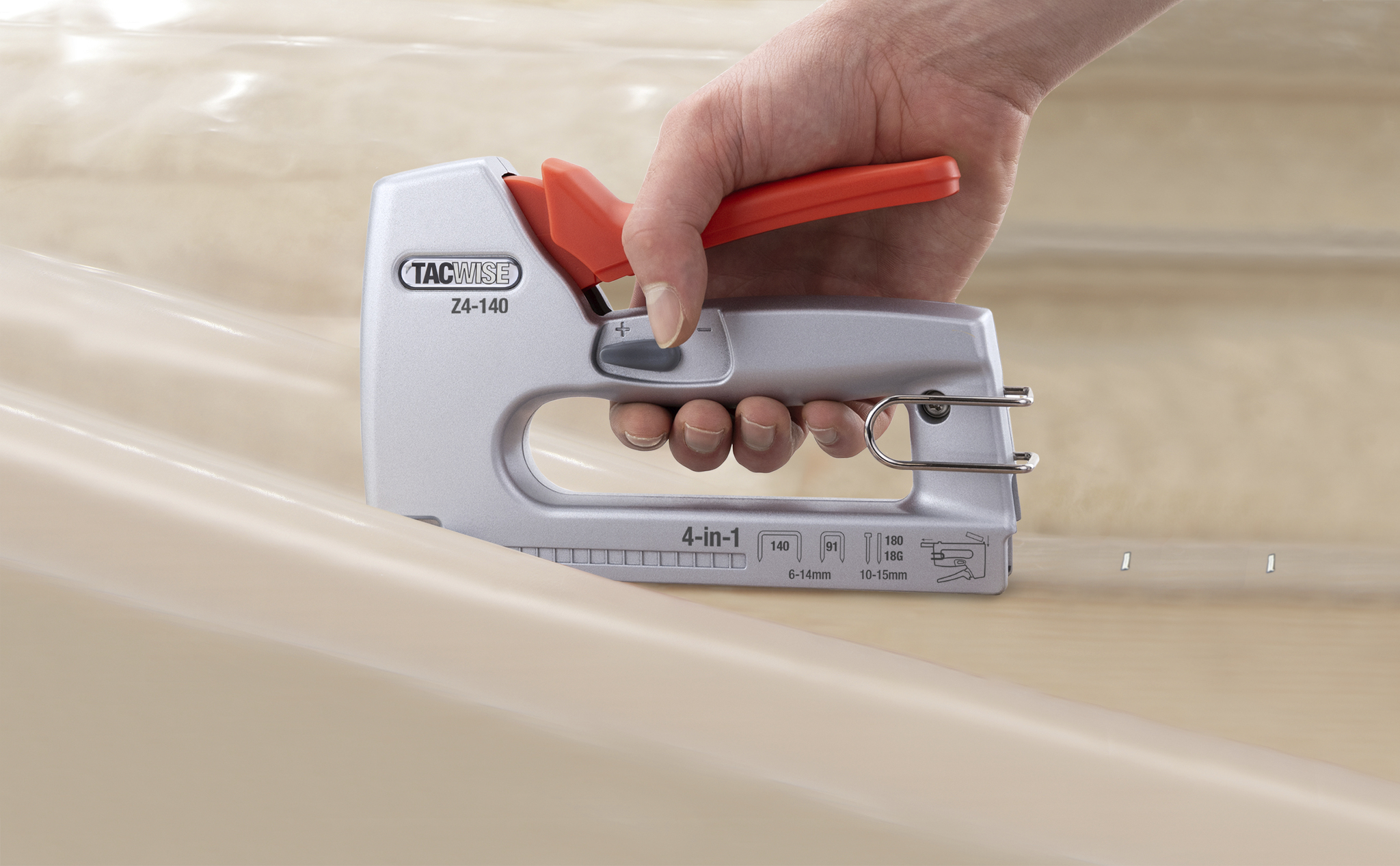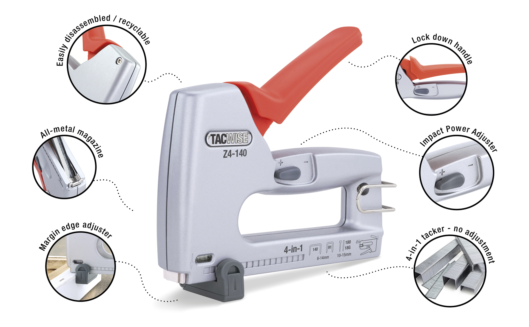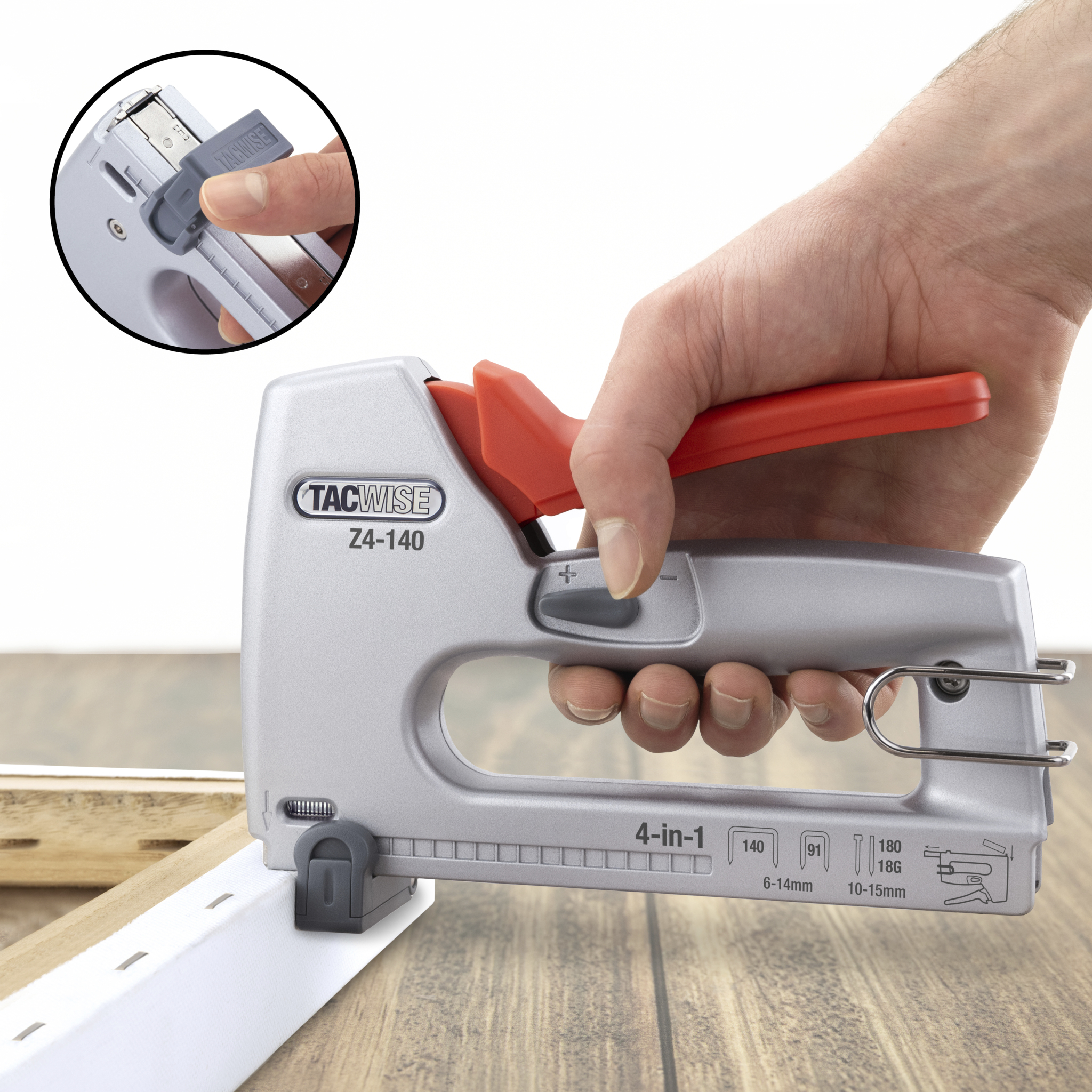 Den nye Z4-140 slutter sig til Europas bredeste kvalitetssortiment af hæfte- og sømprodukter fra Tacwise. Dette kraftfulde, men lette værktøj i aluminium kan affyre 4 forskellige typer fastgørelser (hæfteklammer - 140 type fladtråd og 91 smalle krone, plus 18G søm og 180 serie hovedløse stifter). Dette er den førstehåndshæftemaskine på markedet, som har muligheden for at bruge den professionelle smalle krone hæfteklammer (91-serien) som en del af 4-i-1-udvalget, hvilket gør den perfekt til en række professionelle opgaver, der kræver præcisionsbetjening.