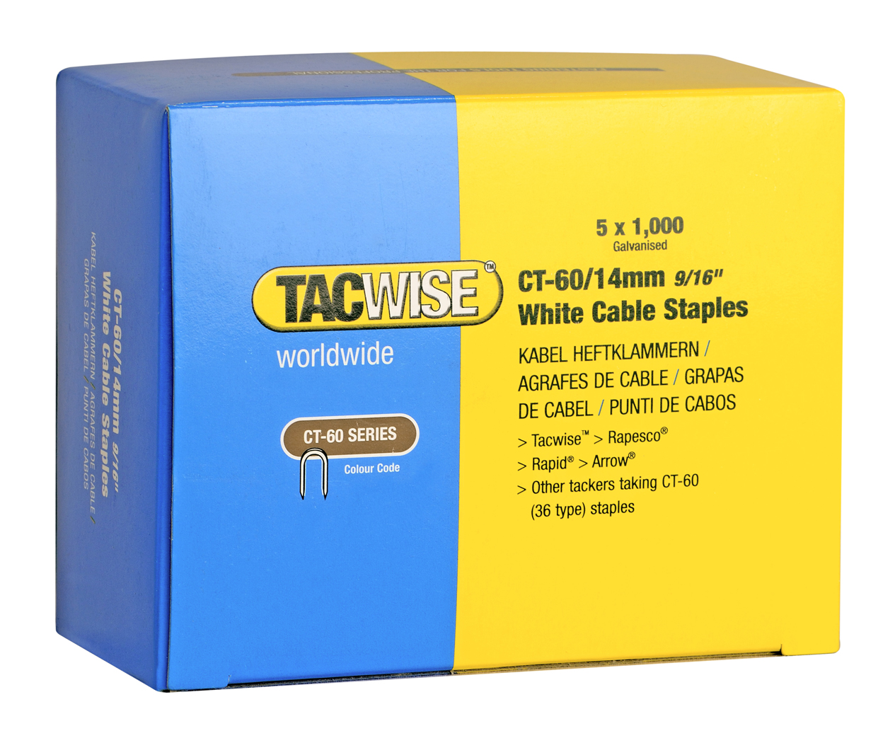 Tacwise CT60 kabel hæfteklammer til kabel op til 6mm. Praktisk bokset i 5 x 1000 pakker. Disse hæfteklammer er velegnet til Cat 5e / Datakabel, Cat 6-kabel, Coaxial Air Spaced 1mm White, Satellit koaksialt screenet, Coaxial air spaced 1mm brown, 2 Core elektrisk kabel i lavspændings applikation og mange andre lavspændingskabler.