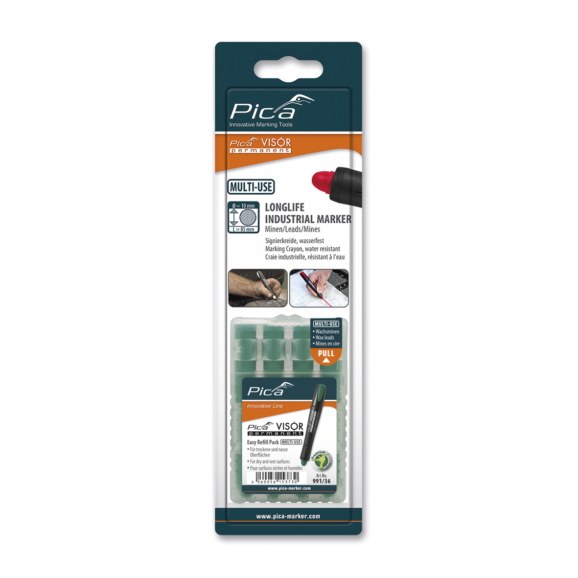 PICA VISOR Industri marker er udviklet efter de højeste kvalitetskrav. Med patenterede løsninger sikres brugeren et effektivt markeringsværktøj til de krævende opgaver. VISOR Refill pakkerne sikrer at der kan veksles mellem farver.
