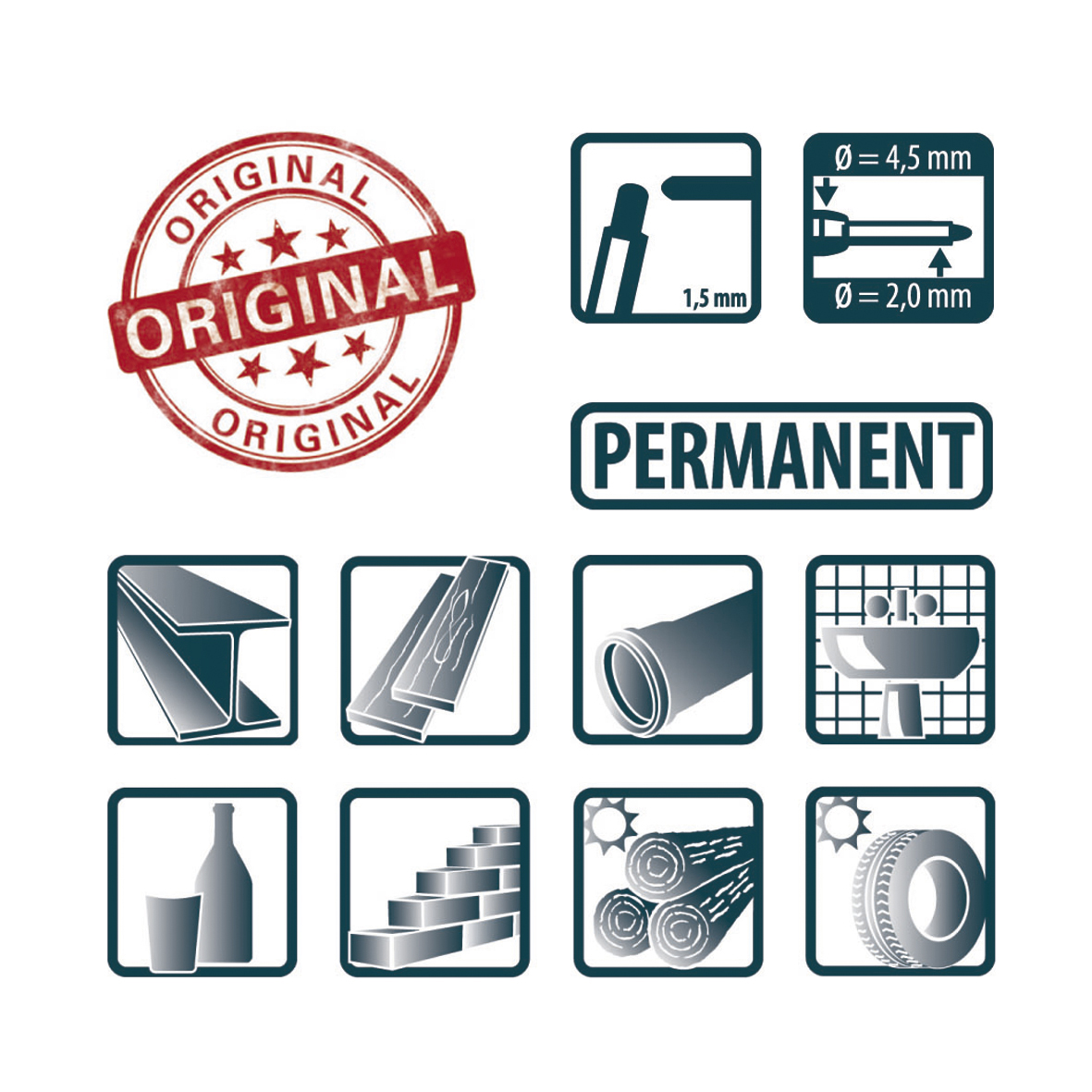 Den originale Pica Ink dybhulsmarker sikrer præcis og holdbar mærkning – selv på svært tilgængelige steder. Den ekstra smalle og lange spids gør det nemt at markere gennem huller, smalle revner og andre udfordrende områder.