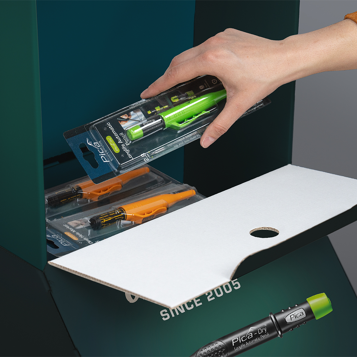 Pica gulvdisplay er en kompakt og effektiv displayløsning, udviklet til effektiv vareeksponering. Det kompakte format gør det velegnet til placering i salgszoner, gange og andre trafikerede områder, hvor synlighed er afgørende. Ideelt til byggemarkeder, grossister og forhandlere, der ønsker professionel produktpræsentation. ⚠️ Leveres kun med følgende indhold: 20 x 2020/SB PICA Powder dybhulsmarkør spray SB, 12 x 2030/SB PICA Powder refill grøn SB, 6 x 55060 Master-Sæt m/bæltetaske, 30 x 3030/SB PICA Dry dybhulsmarkør med hylster SB, 20 x 7070/SB PICA Fine Dry stiftblyant SB, 20 x 150/46/SB PICA Ink dybhulsmarkør sort SB.