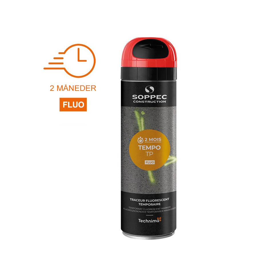 TEMPO TP er en midlertidig markeringsspray, der bruges til korttidsopmærkning (2-8 uger). Dette kridtbaserede produkt kan slettes på mekanisk vis (vandspray, højtryksrenser, børster...). Dette gør det nemt muligt at bruge det på klassificerede eller beskyttede områder, til bymiljø, til landskabsplanlægning. Nem og sikker at bruge, TEMPO TP er udstyret med den patenterede Soppec «TP» sikkerhedssprayhætte. Fremragende vedhæftning på forskellige overflader: asfalt, græs, beton, sand (for andre overflader test før brug).Udstyret med særlig robust sikkerhedshætte (en fuld aerosol, der falder fra en højde på 1,50 m forbliver intakt).Kort markeringsvarighed på op til 8 uger afhængig af overfladen, påføringsbetingelserne og UV-eksponering.Gælder også på fugtige overflader,
