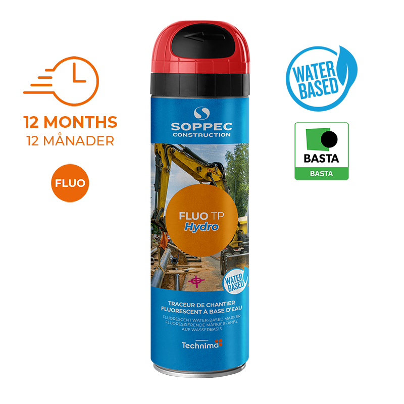 FLUO TP Hydro markeringsmaling til byggepladser har en uovertruffen ydeevne, og hver dåse rækker til 104 symboler eller 80 lineære meter. Direkte synlig på lang afstand (>50 m), hvilket gør det muligt for arbejdere på byggepladsen at arbejde sikkert og præcist, selv fra toppen af ​en kran. Men frem for alt forbliver det synligt i op til 12 måneder. Pålidelig og sikker. Den patenterede sikkerhedssprayhætte, med aftagelig dyse tåler et fald fra 1,5 m ned på en betonoverflade og har den robusthed, der kræves på en byggeplads. FLUO TP Hydro garanterer præcis og kraftfuld mærkning, fra -15 °C til +50 °C. I en konstant stræben efter produkter, der har bedre mærkning, forbedrer brugersikkerheden, Technima derfor udviklet en unik formulering, der erstatter en væsentlig del af opløsningsmidlerne med vand (20%). Det er designet og produceret i Frankrig, og alle ingredienser og produkterne er fuldt sporbare, hvilket er en garanti for certificeret kvalitet.