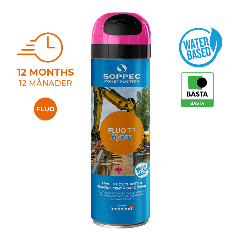 FLUO TP Hydro markeringsmaling til byggepladser har en uovertruffen ydeevne, og hver dåse rækker til 104 symboler eller 80 lineære meter. Direkte synlig på lang afstand (>50 m), hvilket gør det muligt for arbejdere på byggepladsen at arbejde sikkert og præcist, selv fra toppen af ​en kran. Men frem for alt forbliver det synligt i op til 12 måneder. Pålidelig og sikker. Den patenterede sikkerhedssprayhætte, med aftagelig dyse tåler et fald fra 1,5 m ned på en betonoverflade og har den robusthed, der kræves på en byggeplads. FLUO TP Hydro garanterer præcis og kraftfuld mærkning, fra -15 °C til +50 °C. I en konstant stræben efter produkter, der har bedre mærkning, forbedrer brugersikkerheden, Technima derfor udviklet en unik formulering, der erstatter en væsentlig del af opløsningsmidlerne med vand (20%). Det er designet og produceret i Frankrig, og alle ingredienser og produkterne er fuldt sporbare, hvilket er en garanti for certificeret kvalitet.