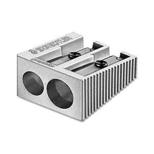 Metal blyantspidser med dobbelthul. Det ene hul er til standard blyanter op til 8.2 mm Ø og det andet til ”jumbo” blyanter op til 10.2 mm Ø. Ekstra lang indføring sikrer, at spidsen ikke flosser.