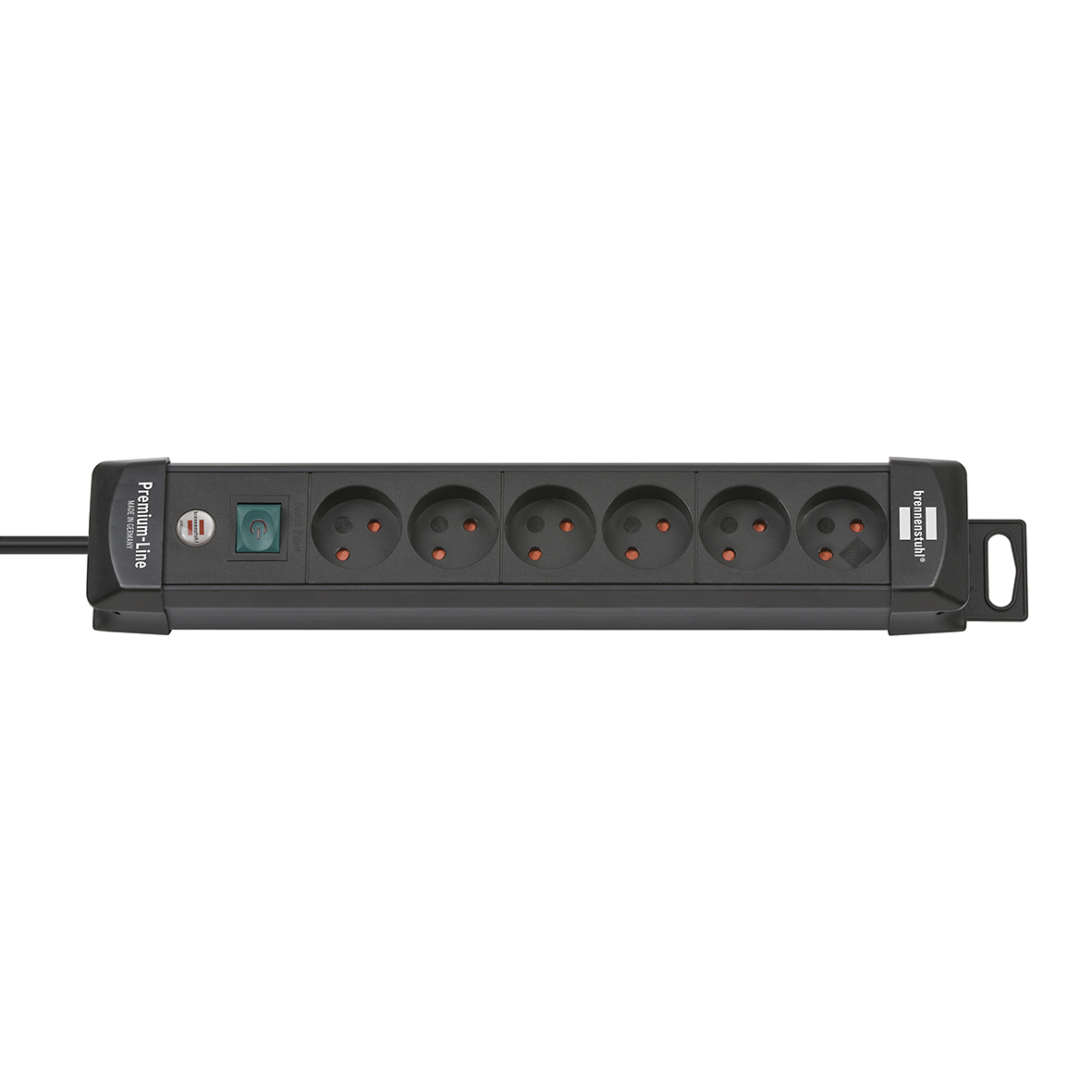 Premium-Line stikdåse med ophængskrog, huller til vægmontering samt mulighed for at vikle ledningen rundt om skinnen.