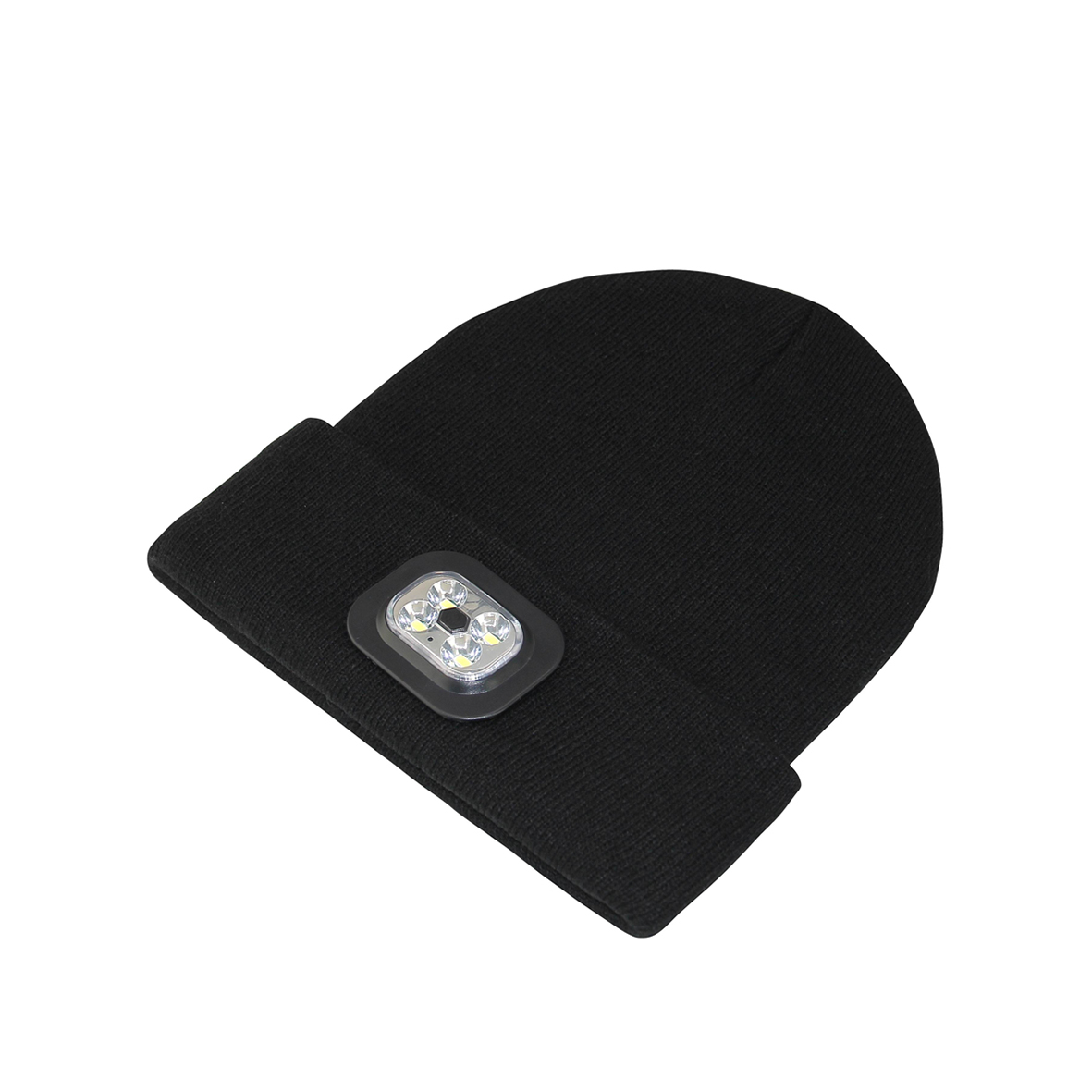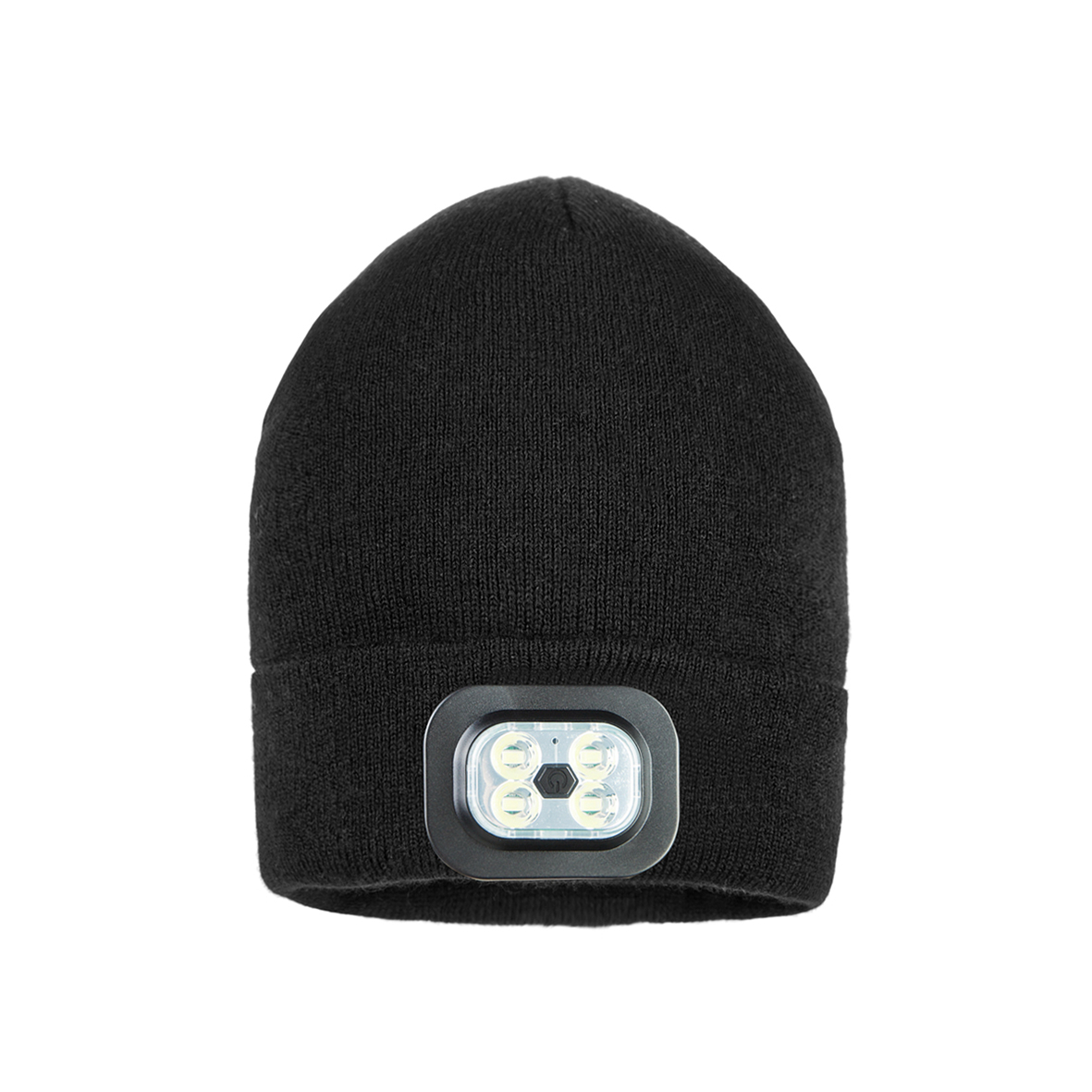 BLUE ELECTRIC Beanie med indbygget kraftig genopladelig LED pandelygte på 200 lumen. Perfekt til alle med hyppige udendørsaktiviteter som f.eks. løb, fiskeri, landbrug, jagt, camping og ridning. På knappen i midten af pandelygten vælges imellem 4 lysfunktioner, høj og lav lysstyrke samt 2 blinkehastigheder. Huens indbyggede batteri lades med det medfølgende micro-USB kabel. LED: 4x50 lumen, lystid op til 7 timer, lysdistance: ca. 18 m.