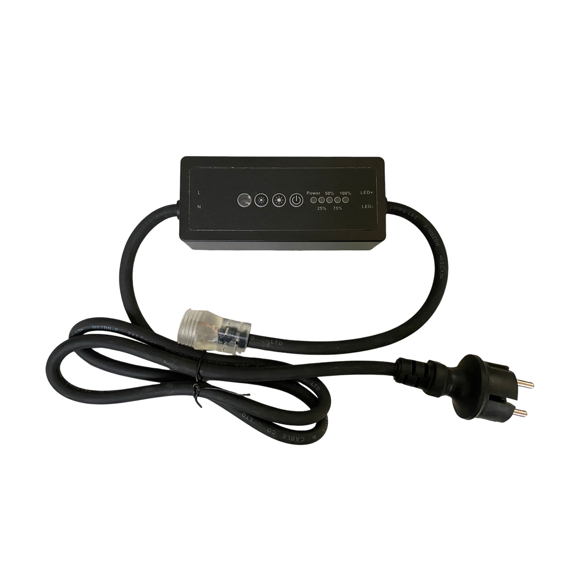 Lysdæmper specielt udviklet til Blue Electric BasicLine og +PlusLine V2.0 samt Gripo LED-strips. Den gør det nemt at regulere lysstyrken i fire trin (25/50/75/100%) og kan desuden bruges til at tænde og slukke for lyset. Montering sker ved at erstatte driveren med lysdæmperen. Er IP65-klassificeret og må derfor også anvendes udendørs under almindelige forhold. ⚠️ Bemærk: Passer ikke til den ældre generation LED-strips (Blue Electric V1.0).