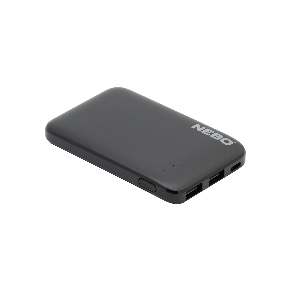 NEBO powerbank på 5000mAh. Der medfølger 45 cm USB-C ladekabel, USB-C til A adapter. Powerbanken er udstyret med LED-indikator for opladning og strømtilstand.