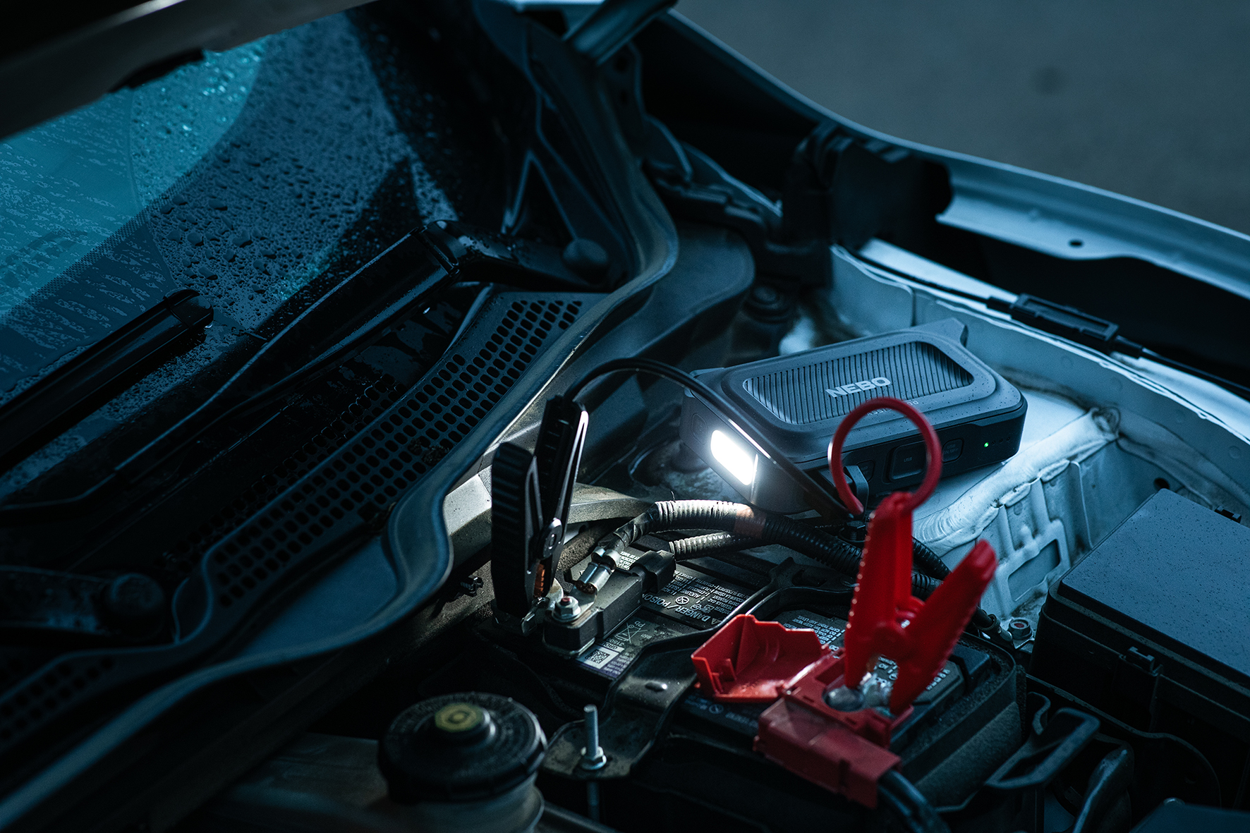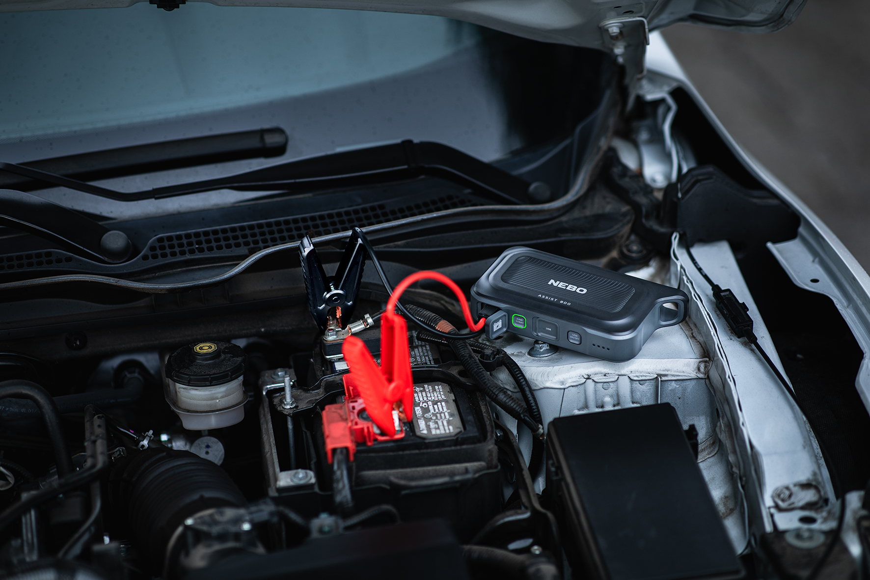 NEBO jumpstarter med startkabler. Jumpstarteren kan endvidere bruges som powerbank.