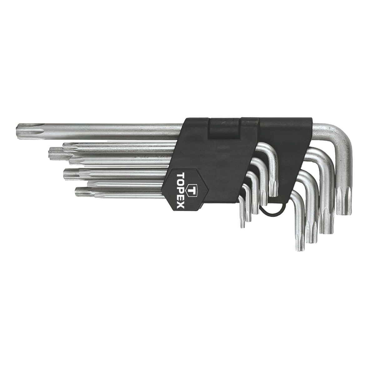 TOPEX Torx-nøgler lavet af slidstærkt kromvanadiumstål for lang levetid. Praktisk holder med et markeret rum til hver nøgle letter opbevaringen.