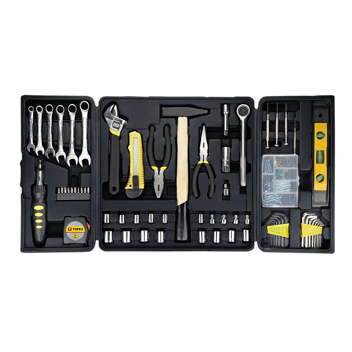 Skralde 3/8" - 185 mmForlænger 3/8", 70 mm Overgangsstykke 1/4" til 3/8"Toppe 1/2": 9, 10, 11, 12, 13, 14, 15, 17 mm + Tændrørstop 16 mmToppe 1/4": 4, 4,5, 5, 6, 7, 8, 9, 10, 11, 12 mm 2 Tænger - 160 mm Skiftenøgle 200 mmBits skruetrækkere Ringgaffelnøgle i størrelserne : 8, 10, 12, 13, 14, 15 mm Unbrakonøgler 1,5, 2, 2,5, 3, 4, 5, 5,5, 6 mm + 1/16", 5/64", 3/32", 1/8", 5/32", 3/16", 7/32", 1/4" Hammer 300g Bits inkluderet - Lige 4-5-6- mm + PH 1-2-3 + Unbrako H3-H4-H5-H6 Hobbykniv 18 mmMålebånd 3 meter Torpedovaterpas 230 mm Umager skruetrækker - lige 1,4 + PH 0-1