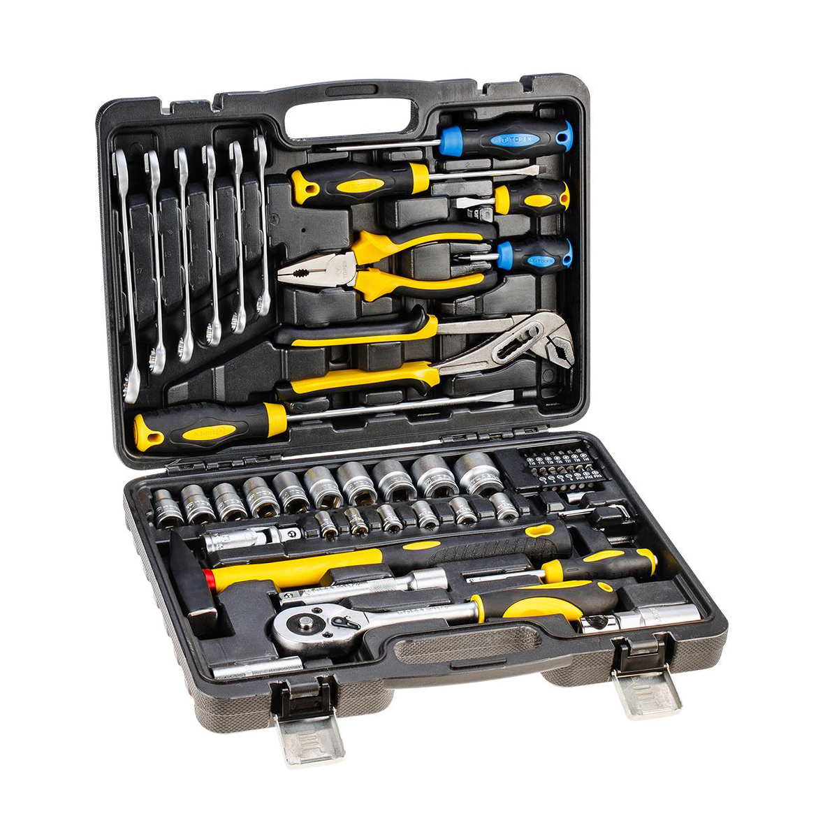 Unbrakonøgler 4 deleSkralde 1/2"Forlænger 1/2", 100 mm Toppe 1/2": 10, 12, 13, 14, 15, 17, 19, 22, 24, 27 mm Bitsholder + 4 bits. 2 Tænger - 160 mm Skruetrækkere 5 stkRinggaffelnøgle i størrelserne : 11, 12, 13, 14, 15, 17 Unbrakonøgler 1,5, 2, 3, 4 mm Skruetrækkere: PH2 x 38 mm , PH2 x 100 mm, PH2 x 200 mm, lige 5,5 x 38 mm, lige 5,5 x 200 mm 1/4" toppe Hammer 300g Driver bits inkluderet T10, T15, T20, T25, T27, T30, T40
