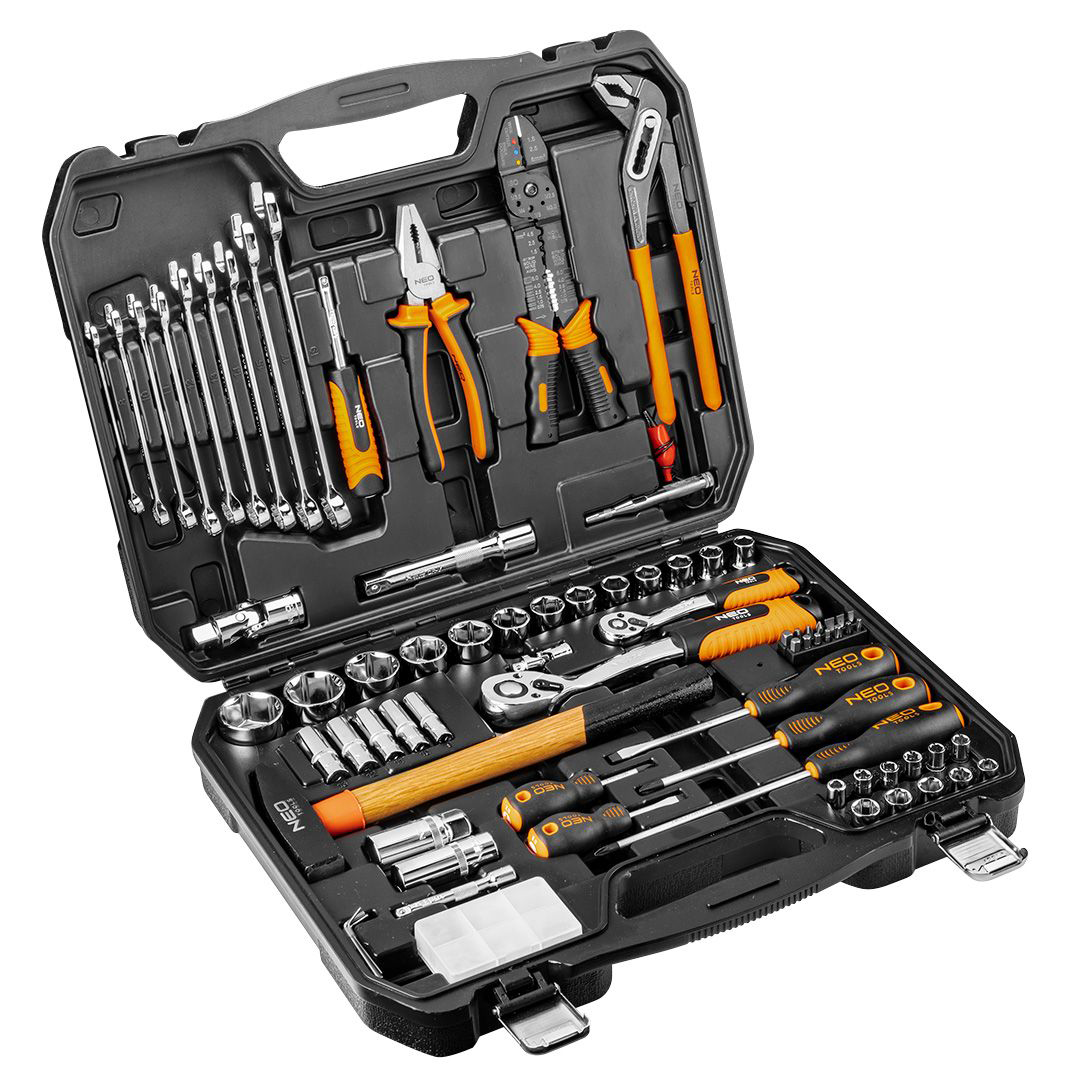 Udstyr:Størrelse 1/2"Fatninger 10,11,12,13,14,15,17,19,22,24,27,30,32 mm, 13 stk.UniversalledLysfatninger: 16 , 21 mm, 2 stk.Forlænger, 125 mmSkraldeStørrelse 1/4"Fatninger 10 stk: 4,5,6,7,8,9,10,11,12,13 mm, 10 stk.Lange fatninger 5 stk: 9,10,11,12,13 mmUniversalled 1 stk.Forlænger 1 stk: 50 mmSkraldeBit holderAdapterBits, 13 stk.TX - 15,20 ,30PH - 1,2,3HEX - 3,4,5,6 mmFD - 4,5,5,7 mm3 stk. Sekskantnøgler: 1,5, 2, 2,5 mmFladnøgler: 8,10,11,12,13,14,15,17,19 mm, 9 stk.Rørnøgle 250 mmTip crimperHammerMultifunktioneltangSkruetrækkere: PZ2x150 mm, 6x100 mm, 5x38 mm PH2x100 mm PH1x38 mmTesterKabelsko, 26 stk.