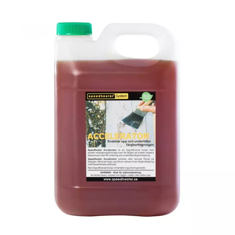 Acceleratorolie er en højraffineret linolie med ekstrem penetration, der får farven til at reagere hurtigt med IR-stråling og letter farvefjernelse. Børst eller sprøjt løst på malingsoverfladen mindst 24 timer op til en måned, før du begynder at fjerne malingen med Speedheater. Sælges i emballage på 2,5 liter