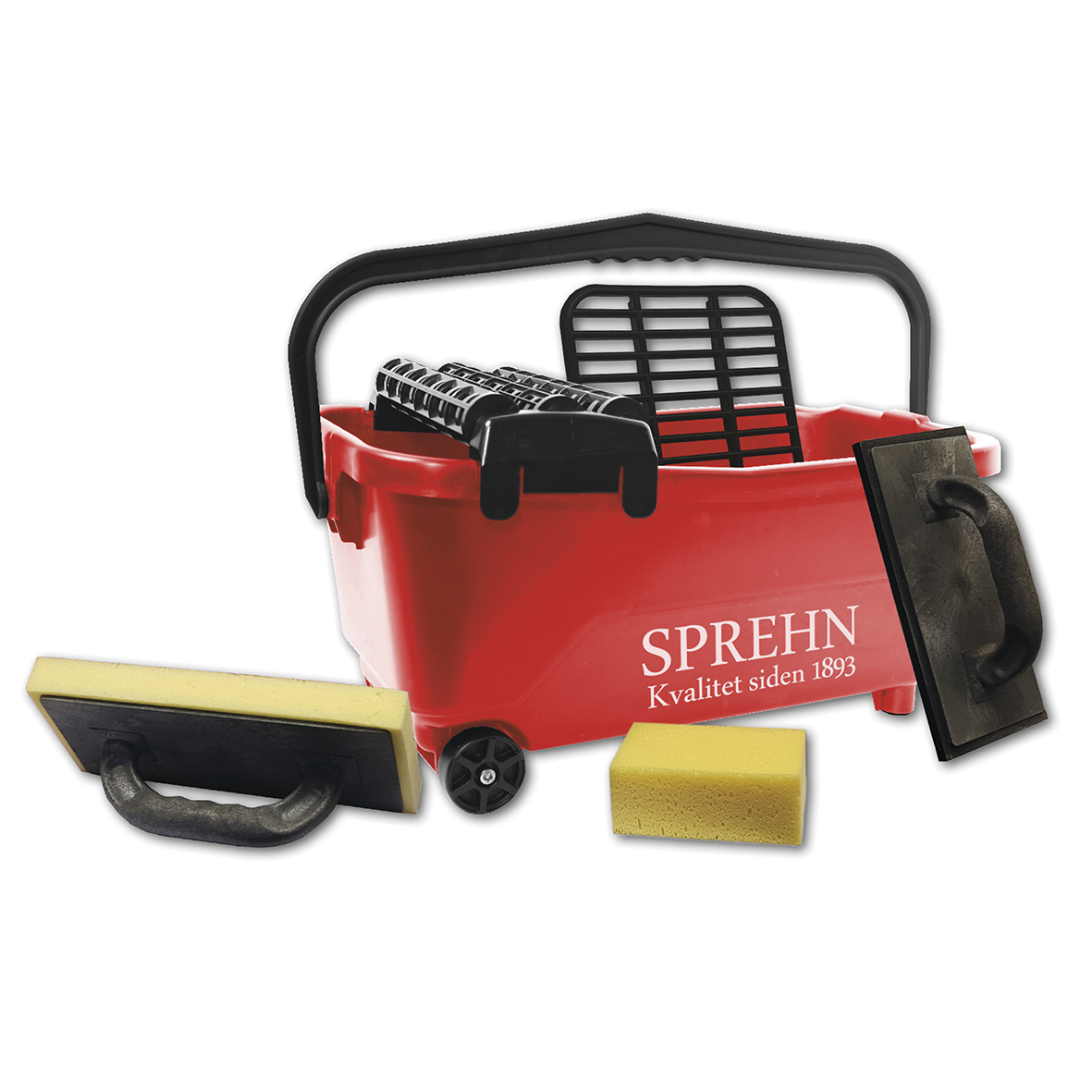 18L Sprehn vaskespand med håndtag og 2 fast monterede hjul, 3 Plastruller og rist, inkl 140x280x30mm hydrobræt, 140x280x10mm fugebræt og svamp.