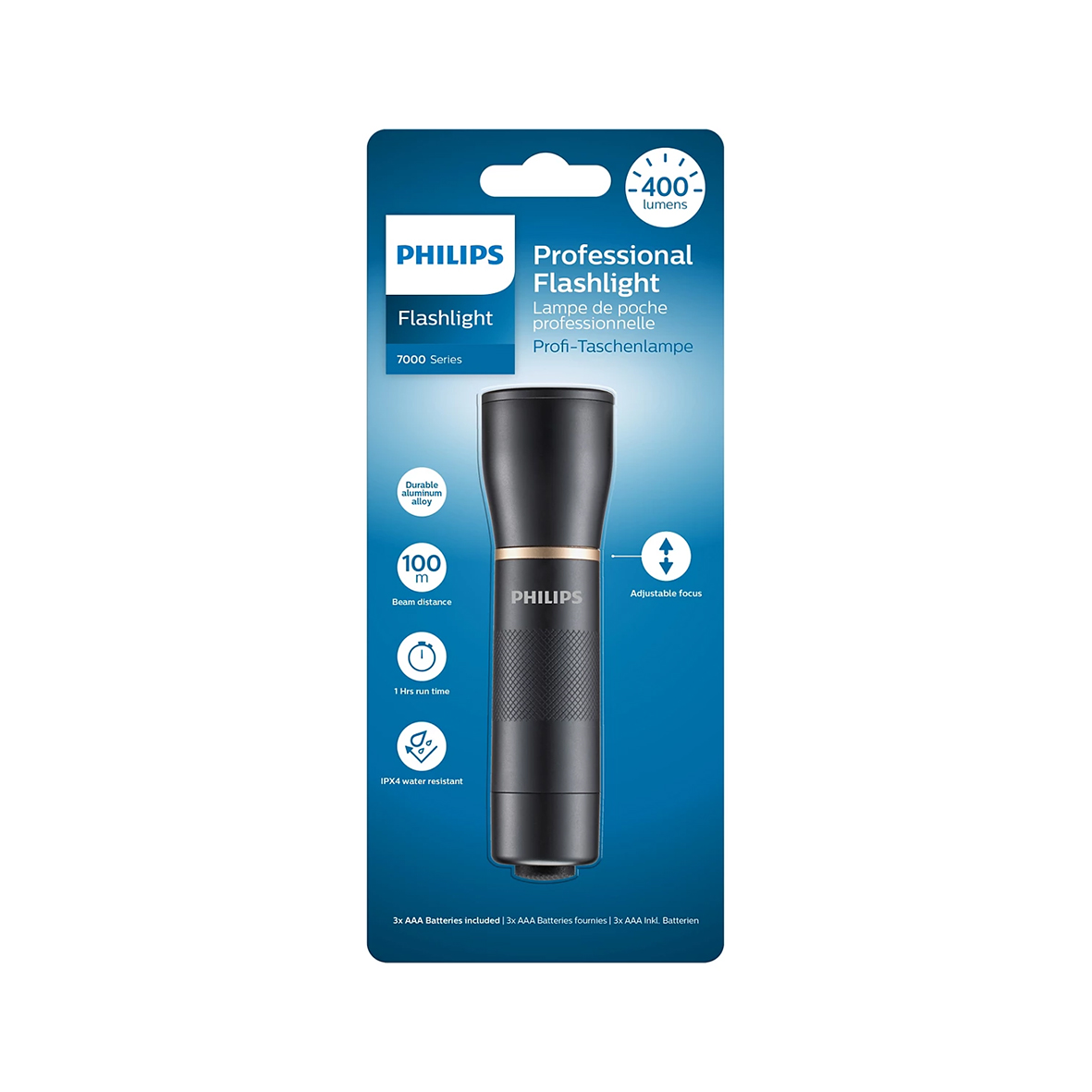 Philips SFL7000T fra 7000-serien er en robust og pålidelig LED-lygte til hverdagsbrug – perfekt til opgaver i og omkring hjemmet. Den leverer en lyseffekt på 400 lumen, en rækkevidde op til 100 meter og en driftstid på op til 40 timer, afhængigt af lysstyrken. Med vandafvisende IPX4-beskyttelse og medfølgende Alkaline AAA-batterier er den klar til brug i al slags vejr.