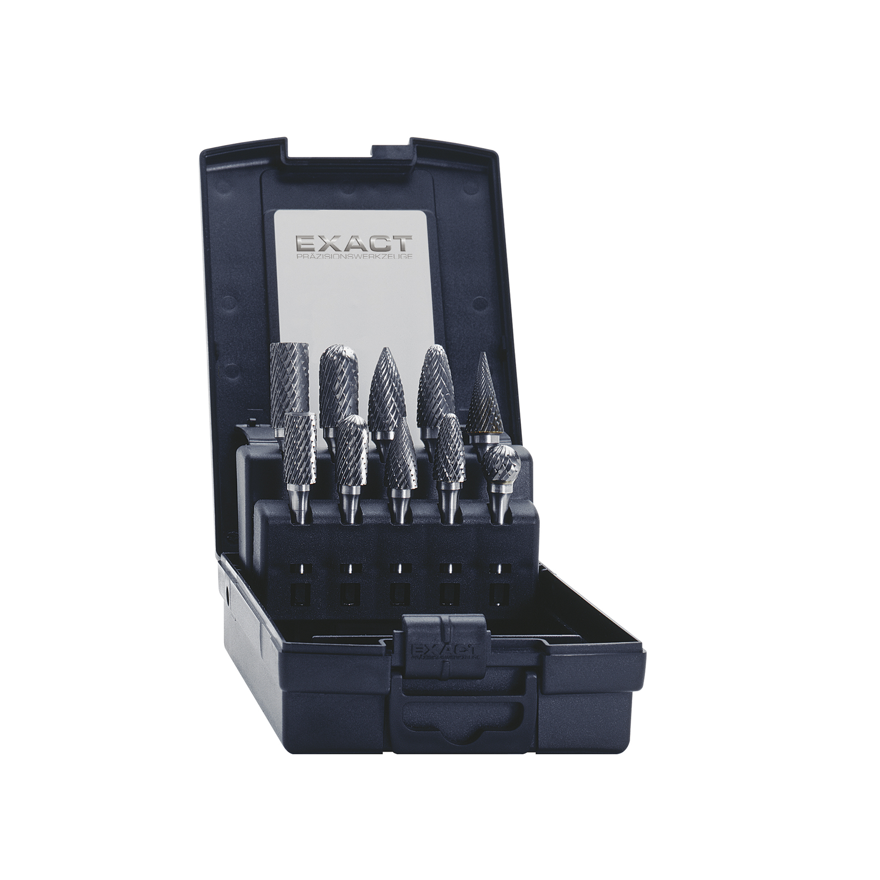 Kan anvendes til støbejern, kunststoffer, højlegeret stål, rust-, syre, og varmebestandigt stål.Indhold (hver form 1 x Ø10 mm + 1 x Ø12 mm): 2 x form A, (ZYA) cylindrisk uden endeskær 2 x form C, (WRC) afrundet top 2 x form G, (SPG) spids 2 x form F, (RBF) afrundet top + 1 stk. form D, (KUD) kugle Ø12 mm + 1 stk. form M, (SKM) konisk Ø12 mm