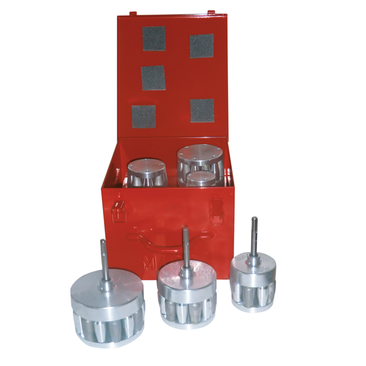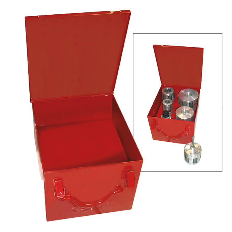 Kraftig metalkuffert med håndtag og plads til 5 forskellige størrelser rørudvidere.