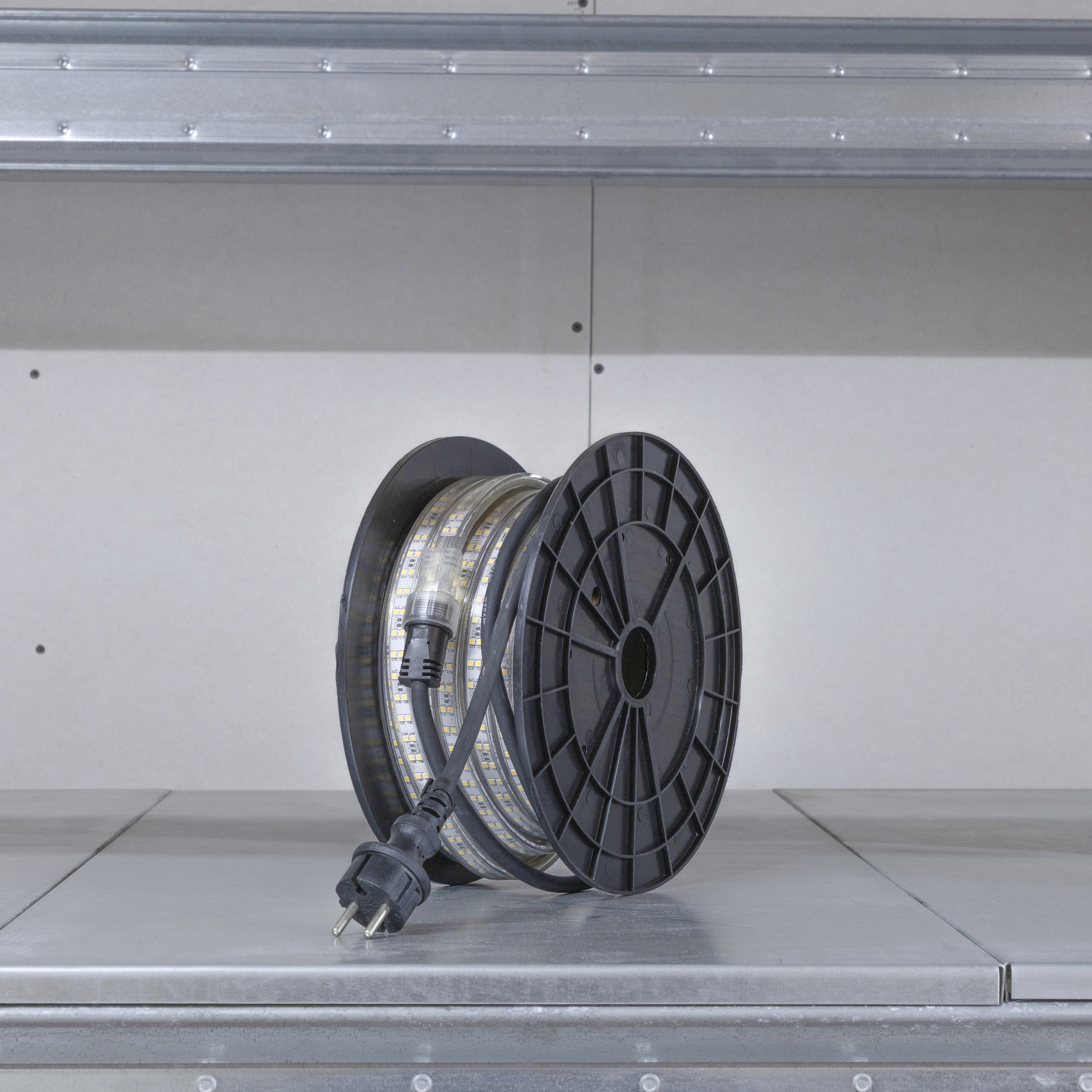 LED-strip udviklet til effektiv og midlertidig belysning på f.eks. byggepladser, i trappeopgange og andre arbejdsområder. Med 1500 lumen pr. meter og 4000K farvetemperatur får du et klart og behageligt lys. Den er IP65-klassificeret, hvilket gør den velegnet til både inde- og udendørs brug – også i kolde omgivelser helt ned til -25 °C. Strippen monteres nemt med clips eller kabelbindere og leveres klar til brug med 1,5 meter 230V tilslutningskabel. Må afkortes (se manual) og kan forlænges op til 50 meter via det medleverede tilslutningskabel eller helt op til 100 meter ved brug af tilslutningskabel 9502 (tilkøb). ⚠️ Vigtigt: Skal altid være fuldt udrullet ved brug for at undgå overophedning.